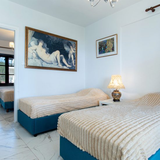 RENOVATED Family room 35 sqm facing the sea, the pool with direct view to Athos and the deep blue. The room consists of two bedrooms, one bathroom and two balconies or two terraces with a comfortable living area. On the first room there is one double bed, on the second room two single beds. Ideal for families! Closet-wardrobe, sat TV, Safe, Air condition, fridge, water boiler, bathroom amenities, hair dryer. FREE WiFi. NO SMOKING